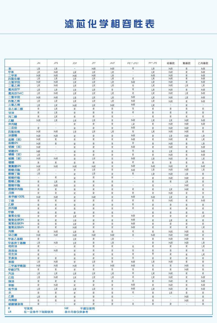 濾芯化學相容性表